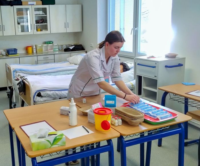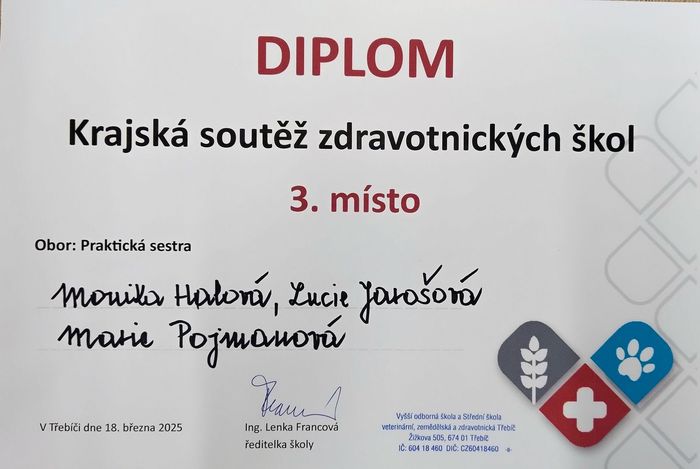 Krajská soutěž zdravotnických škol v Třebíči zná své vítěze. Naši školu reprezentovalo družstvo 3. ročníku Praktické sestry Lucie Jarošová, Monika Halová a Marie Pojmanová, které obsadilo skvělé 3. místo! Děvčata si dokázala velmi dobře poradit se situací v simulačním centru, kde prokázala výborné teoretické znalosti i praktické dovednosti. Gratulujeme!