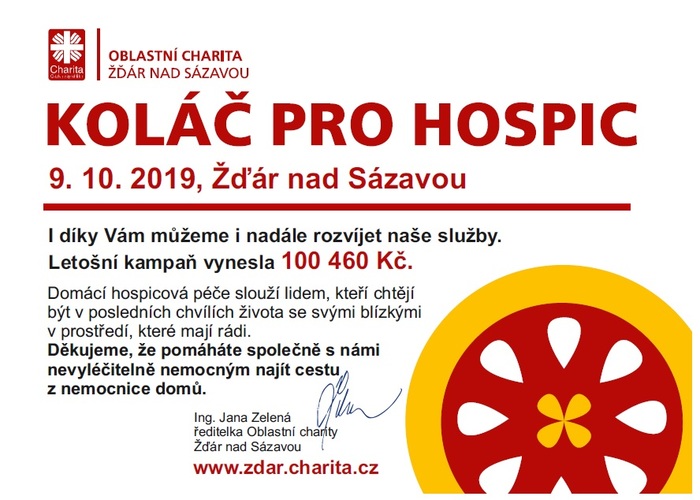 Ve středu 9. října 2019 se naše škola zapojila do tradiční akce „Koláč pro hospic“, který organizovala Oblastní charita Žďár na Sázavou. Formou dobrovolného příspěvku do charitativní kasičky měli lidé možnost přispět na podporu péče o těžce nevyléčitelně nemocné a umírající lidi a získat tak chutný koláč. Velké poděkování patří žákyním čtvrtého ročníku, které s velkým nasazením oslovovali obyvatele města a vysvětlovali význam zařízení pro nevyléčitelné pacienty - hospice. Celá akce byla zdařilá a jsme velmi rádi, že naše škola mohla přispět na dobrou věc.