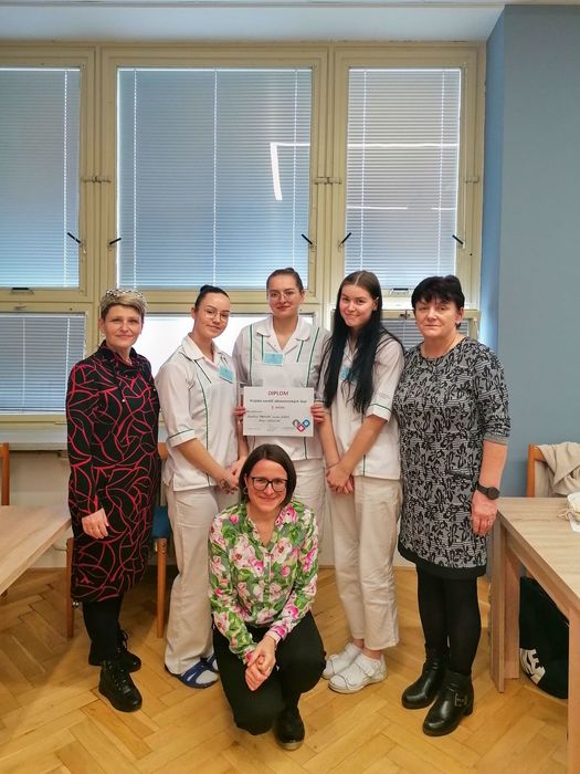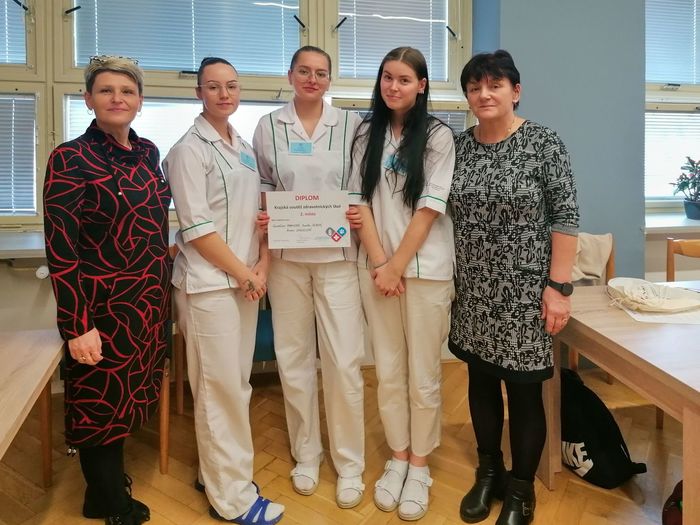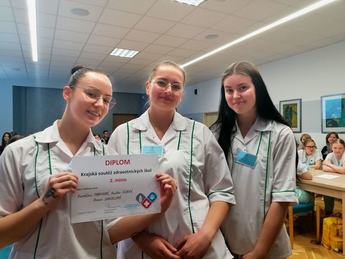 I letos se naše škola zúčastnila krajské soutěže zdravotnických škol pořádané VOŠ a SŠ Třebíč. V kategorii SŠ nás reprezentovalo 3členné družstvo ve složení Anna Danihelová, Karolína Pohanková a Radka Judová ze 3.A (obor Praktická sestra). Soutěžilo se v 6 disciplínách se zaměřením na znalosti ze somatologie, klinické propedeutiky, historie a teorie ošetřovatelství a na dovednosti z první pomoci, stlaní lůžek a provádění vybraných ošetřovatelských výkonů. Jmenovaným žákyním děkujeme za reprezentaci školy a blahopřejeme k získání krásného 2. místa.