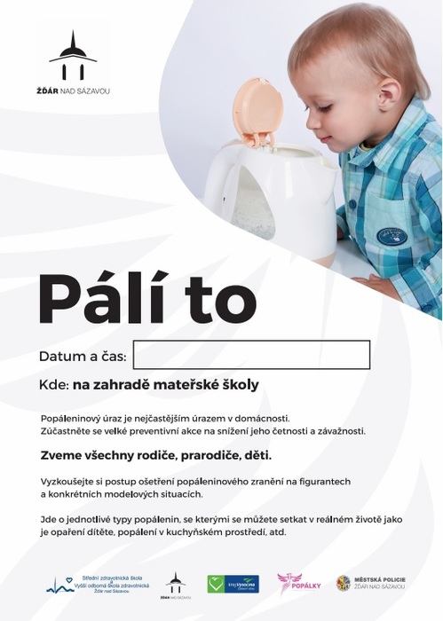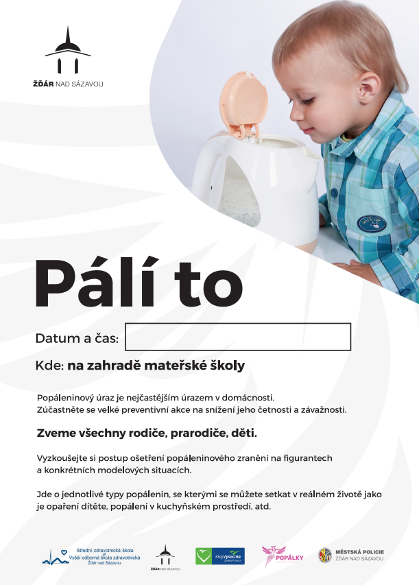 Cílem projektu je rozvoj základních znalostí a praktických dovedností u termických poranění, zmenšit riziko dalších komplikací způsobených nesprávnou první pomocí. Zároveň snaha osvětovou činností snížit riziko vzniku a závažnosti tohoto druhu poranění. Zvýšit právní povědomí rodičů dětí v oblasti přestupkového či trestních činů. Posílit vědomí předškolních dětí o chování v rizikových situacích (dopravní prostředky, návykové látky, vztah k volně pobíhajícím zvířatům). Zlepšení životního prostředí, životních podmínek pro občany a návštěvníky města Žďáru nad Sázavou. Zapojení veřejnosti do participace, prohlubování aktivního přístupu občanů k pozitivním změnám nejen ve veřejném prostoru, podpora komunitního života.