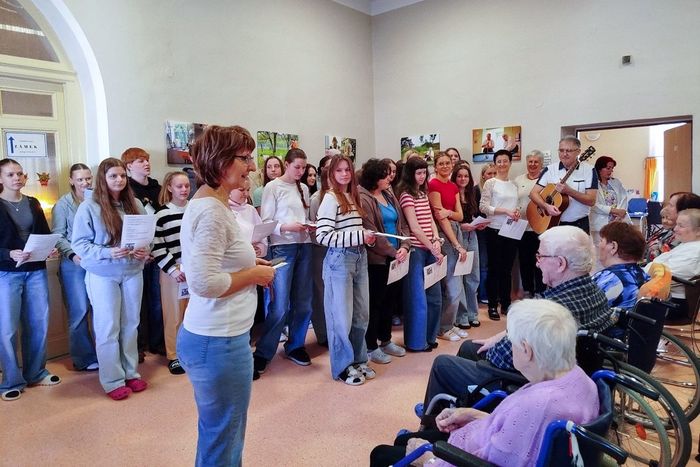 Studentky a studenti se v doprovodu pedagogického dozoru zúčastnili odpolední exkurze do Domova pro seniory na Mitrově. Klientům i personálu přinesli příjemné osvěžení v podobě pásma nejznámějších lidových písní. Zpěv byl doprovázen hrou na kytaru, zazněly ale také bubínek, triangly apod. Vystoupení se líbilo, důkazem bylo to, že mnozí z posluchačů se k hudební produkci rádi připojili také.