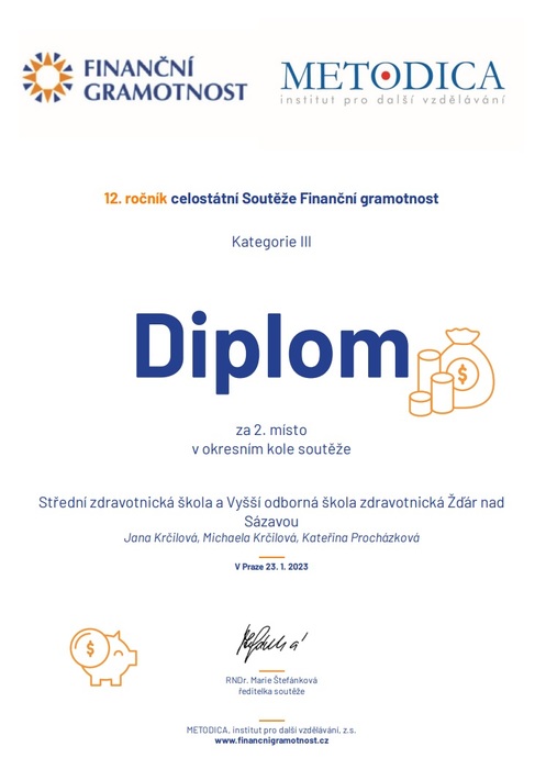 Stejně jako každý rok se i letos naše škola zapojila do soutěže Finanční gramotnost. Letos to už byl 12. ročník. Školního kola se zúčastnilo 80 žáků 3.L, 4.A a 4.L. Školní i okresní kolo probíhalo na počítači a žáci museli vyplnit zadaný test. Do okresního kola postoupila děvčata Jana Krčilová, Michaela Krčilová, Kateřina Procházková ze 3.L., kde se děvčata umístila na pěkném 2. místě. Blahopřejeme.