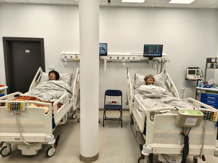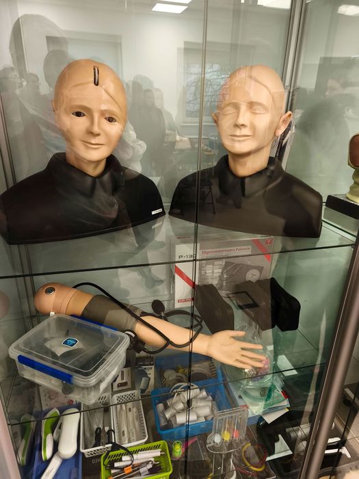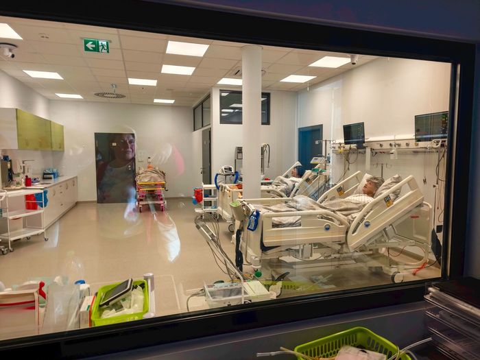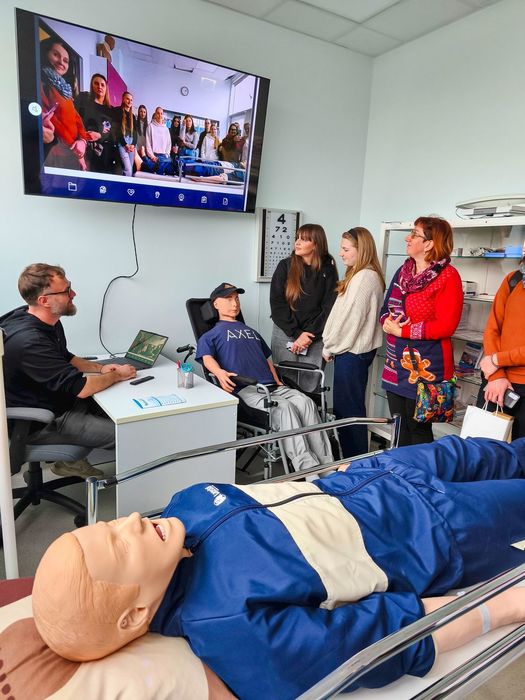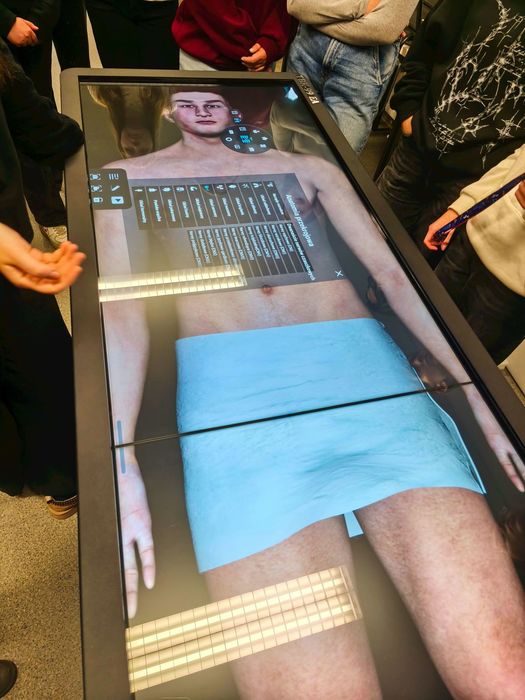 Odpoledne jsme si prošli zdravotnické simulační centrum, které slouží k přípravě žáků na praktické úkony v nemocnici. Místo pacientů zde na nemocničních lůžkách leží figuríny, se kterými můžeme manipulovat, aplikovat jim injekce nebo podávat léky. Na monitorech lze přitom online sledovat jejich základní životní funkce. Figuríny mohou dokonce reagovat na jednotlivé podněty, vyjadřovat emoce a pocity diskomfortu tak, aby se jednotlivé situace co nejvíce přiblížily skutečnému nemocničnímu prostředí. Nejzajímavějším exponátem byl zřejmě anatomický stůl s dotykovým displejem, který umožňuje detailní vizualizaci jednotlivých orgánů lidského těla, svalů, cév a nervů ve 3D formě.