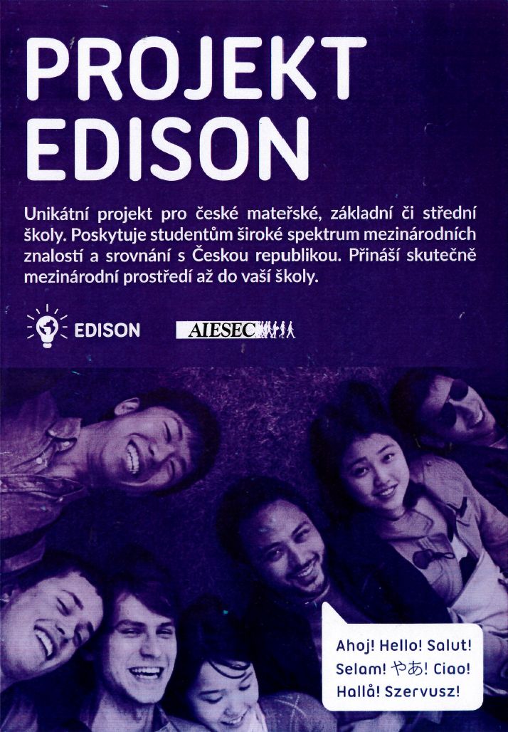 Projekt EDISON je vzdělávací projekt, který oživuje výuku a zvyšuje zájem studentů o studium anglického jazyka. Studenti se prostřednictvím stážistů seznamují se zvyky a tradicemi jiných zemí, což vede k překonávání předsudků o jednotlivých kulturách. Projektu Edison, který proběhne od 10. do 17. 2. 2019 na naší škole, se zúčastní šest stážistů z Evropy a Asie. Ti budou ubytováni v hostitelských rodinách z řad studentů a v rámci svého programu budou ambasadory svých zemí, které představí formou prezentací v jednotlivých hodinách. Zprostředkovatelem této akce je mezinárodní studentská organizace AISEC.